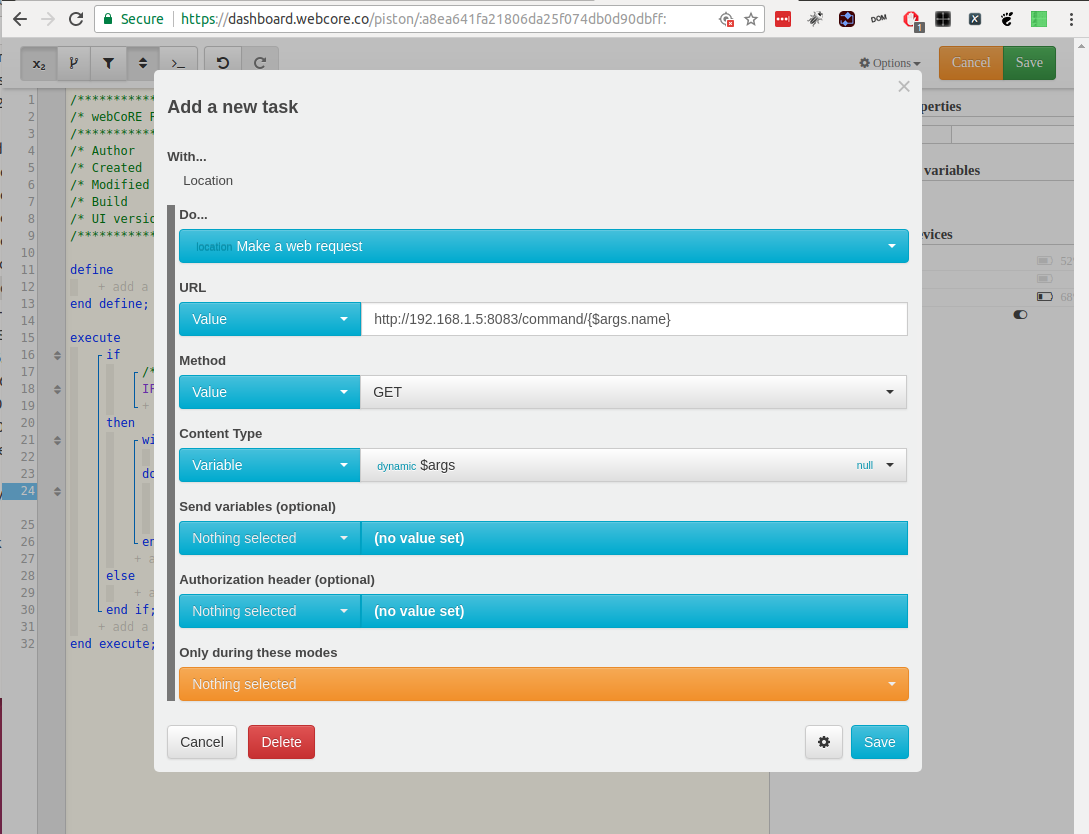 Next add the do part of the statement. Configure the Value URL as shown using your device hosting the bashttpd server IP and port. I used the IP address of my docker container. This request will be executed by SmartThings on your local LAN, so you don’t need to worry about port forwarding or firewalls. Configure the rest of the statement as shown in the last image.